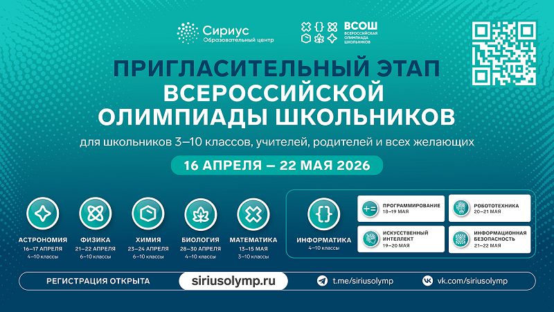 С 16 апреля по 22 мая проходит онлайн-олимпиада на платформе «Сириус.Курсы» для учеников 3–10 классов (математика, информатика, физика, химия, биология, астрономия).