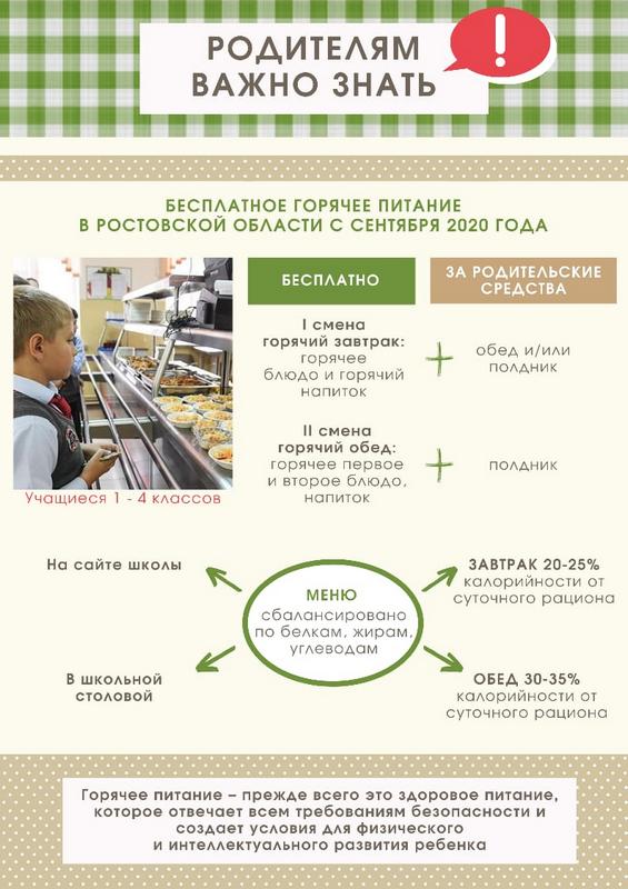 Обучающиеся 1-4 классов имеют право на получение бесплатного одноразового горячего питания (в виде завтрака), предусматривающего наличие горячего блюда, не считая горячего напитка, за счет бюджетных ассигнований федерального и областного бюджетов.