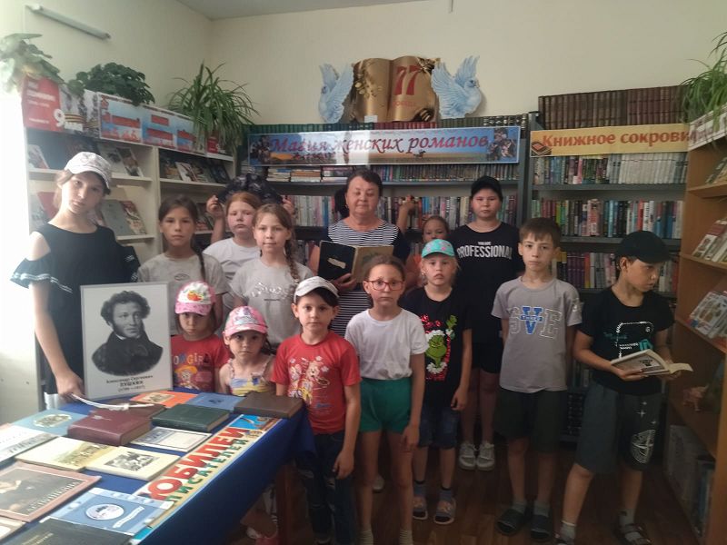 Сегодня состоялась викторина с просмотром мультфильмов "Сказки Пушкина", экскурсия в сельскую библиотеку. Библиотекарь Карпова И. В. провела беседу Книги А. С. Пушкина, дети нарисовали рисунки.