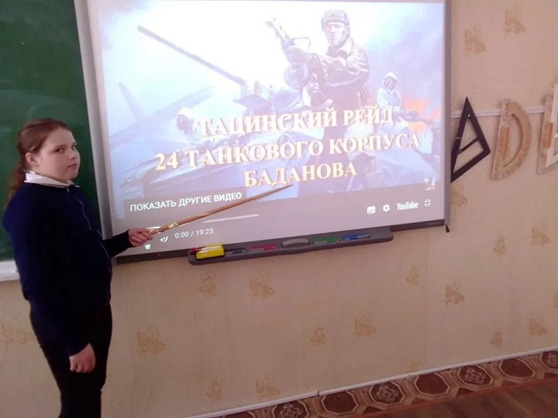 На этих уроках учащиеся смотрели и обсуждали видеофильмы о суровых днях войны, совершили путешествие в военное прошлое нашей Родины, нашего района. А также побывали на виртуальной экскурсии по местам боевой славы. Ученики начальных классов нарисовали рисунки на данную патриотическую тему.