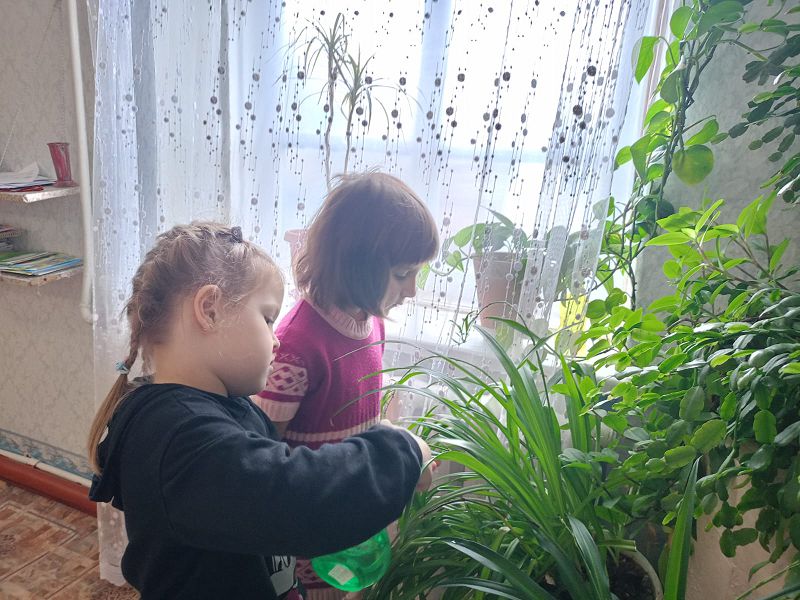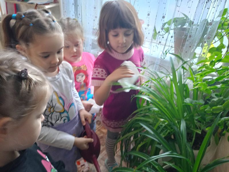 Ребята с удовольствием помогают ухаживать за комнатными растениями. Поливают, протирают крупные растения, опрыскивают листья. Такие трудовые поручения воспитывают интерес к комнатным растениям и вызывают желание ухаживать за цветами.