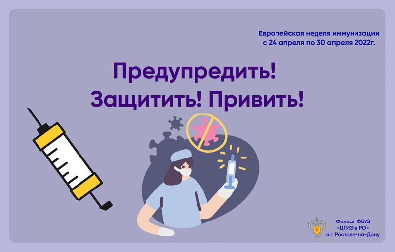 Ежегодно под эгидой Европейского регионального бюро Всемирной организации здравоохранения проводится Европейская неделя иммунизации (ЕНИ). В 2022 году акция пройдет с 24 по 30 апреля под девизом: «Предупредить! Защитить! Привить!». Первостепенной целью ЕНИ является содействие продвижению иммунизации для защиты людей всех возрастов от вакциноуправляемых инфекционных заболеваний и расширение знаний о пользе вакцинации.