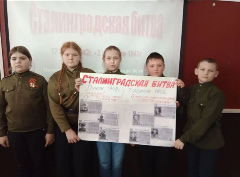 В нашей школе прошли мероприятия, приуроченные к этой дате.В ходе мероприятий ребятам рассказали о битве за Сталинград, о героизме и мужестве советских солдат, о командном составе, о подвигах рядовых солдат, медсестёр и даже детей.